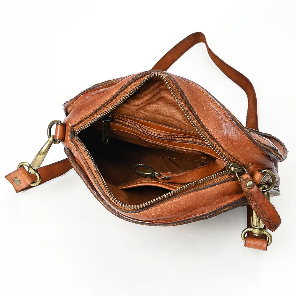 Antique-finished metal fittings and decorative rivets give it that rugged, old-soul charm, while the round canteen shape keeps it unique and timeless. The adjustable leather strap makes for easy, comfortable wear, and the YKK zipper closure ensures everything stays tucked in securely.