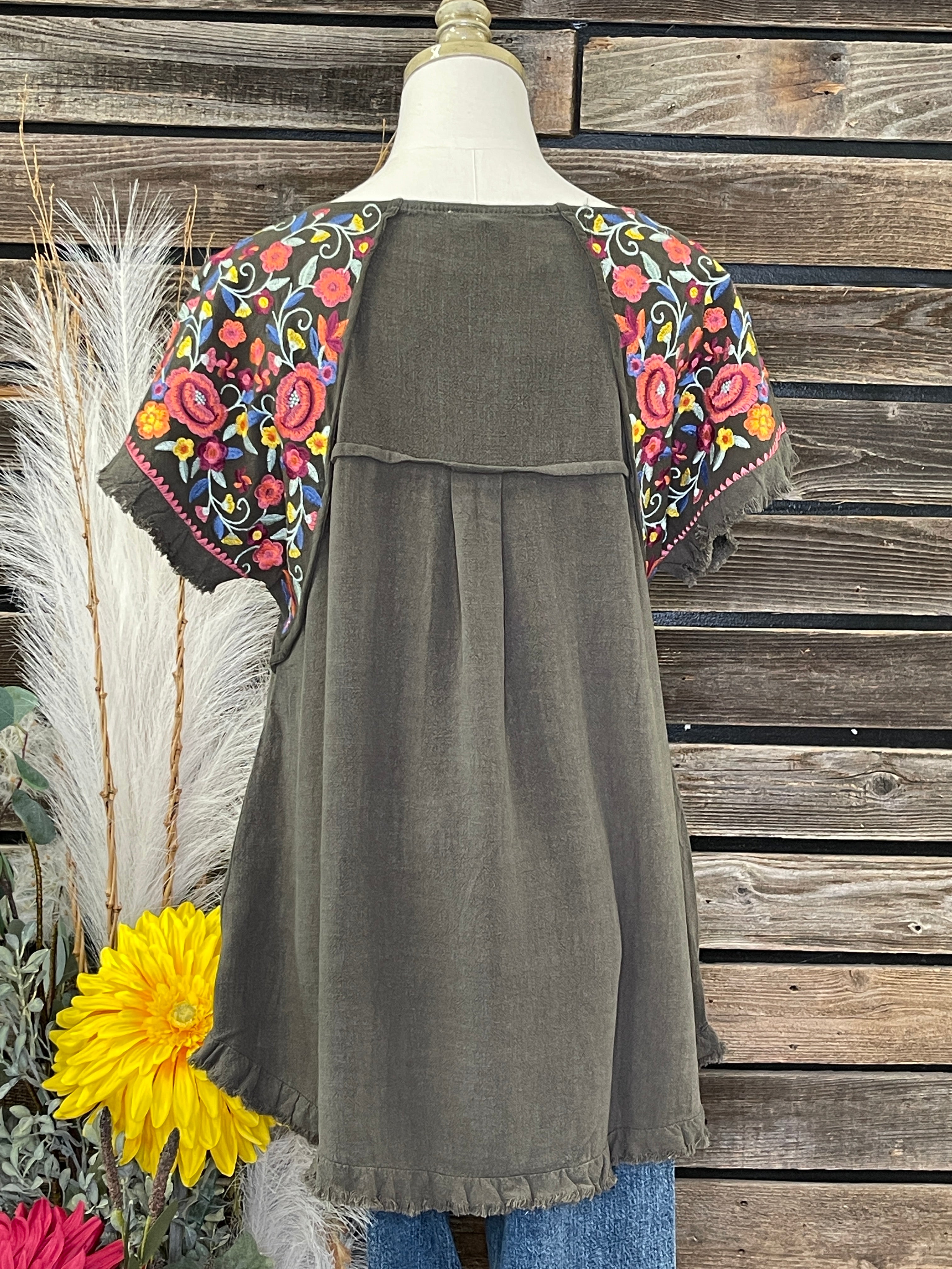 The soft olive body keeps it easy and comfortable, while those embroidered sleeves do all the talking—bright, cheerful florals in bold pops of red, yellow, and blue give it a handcrafted charm you can’t help but love. The frayed hemline adds that perfectly lived-in feel, making it the kind of top you’ll reach for when you want to look put-together without trying too hard. Pair it with denim and sandals, and you’re ready for anything from farmers’ market mornings to dinner on the patio.