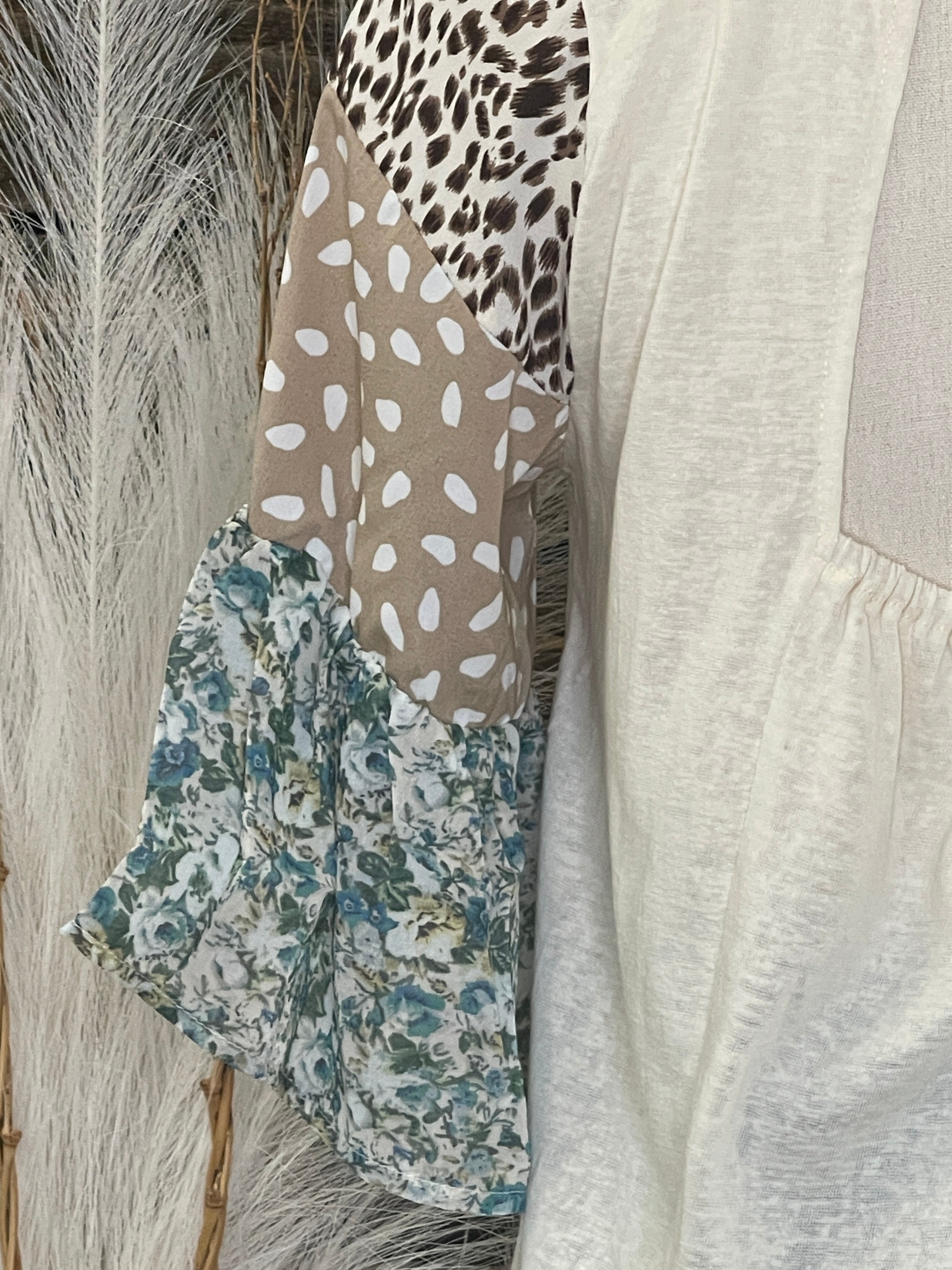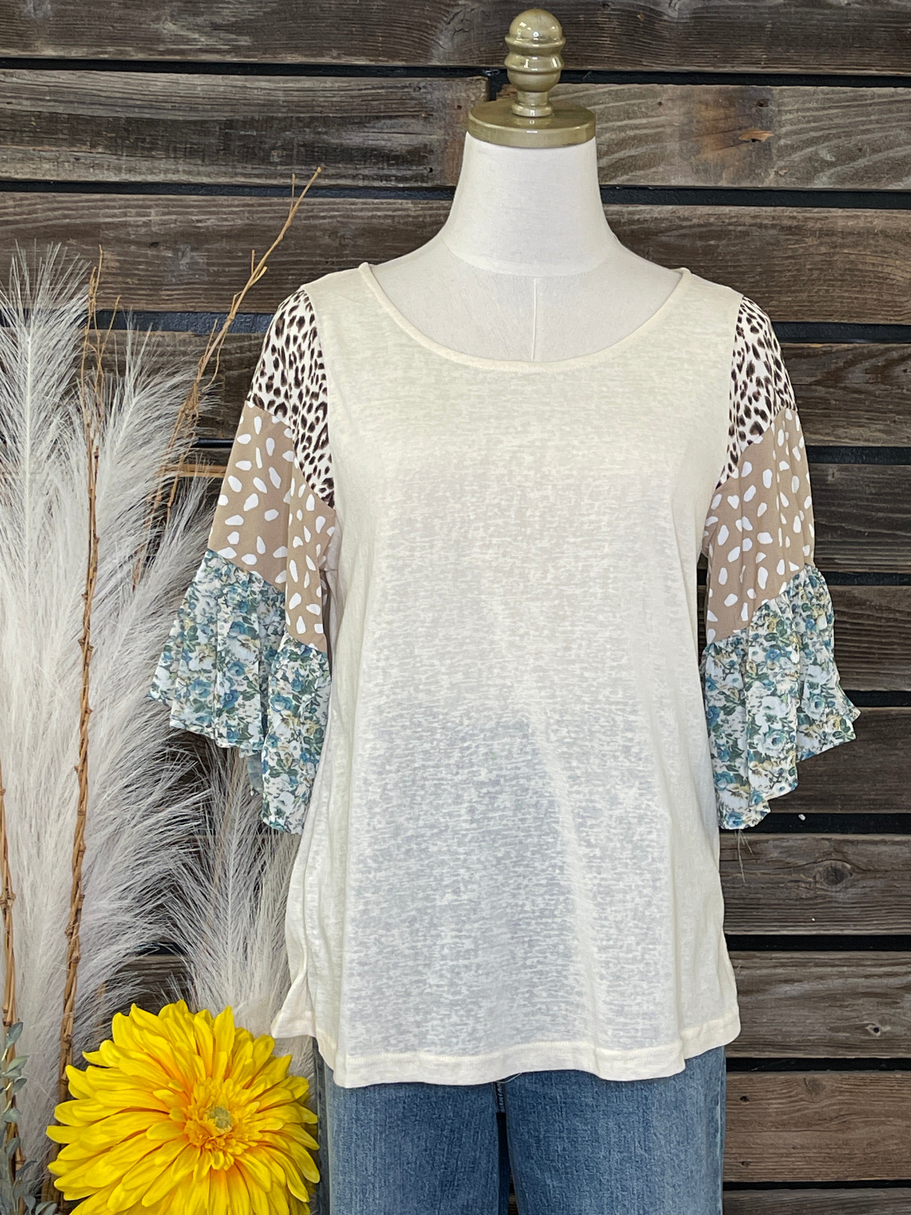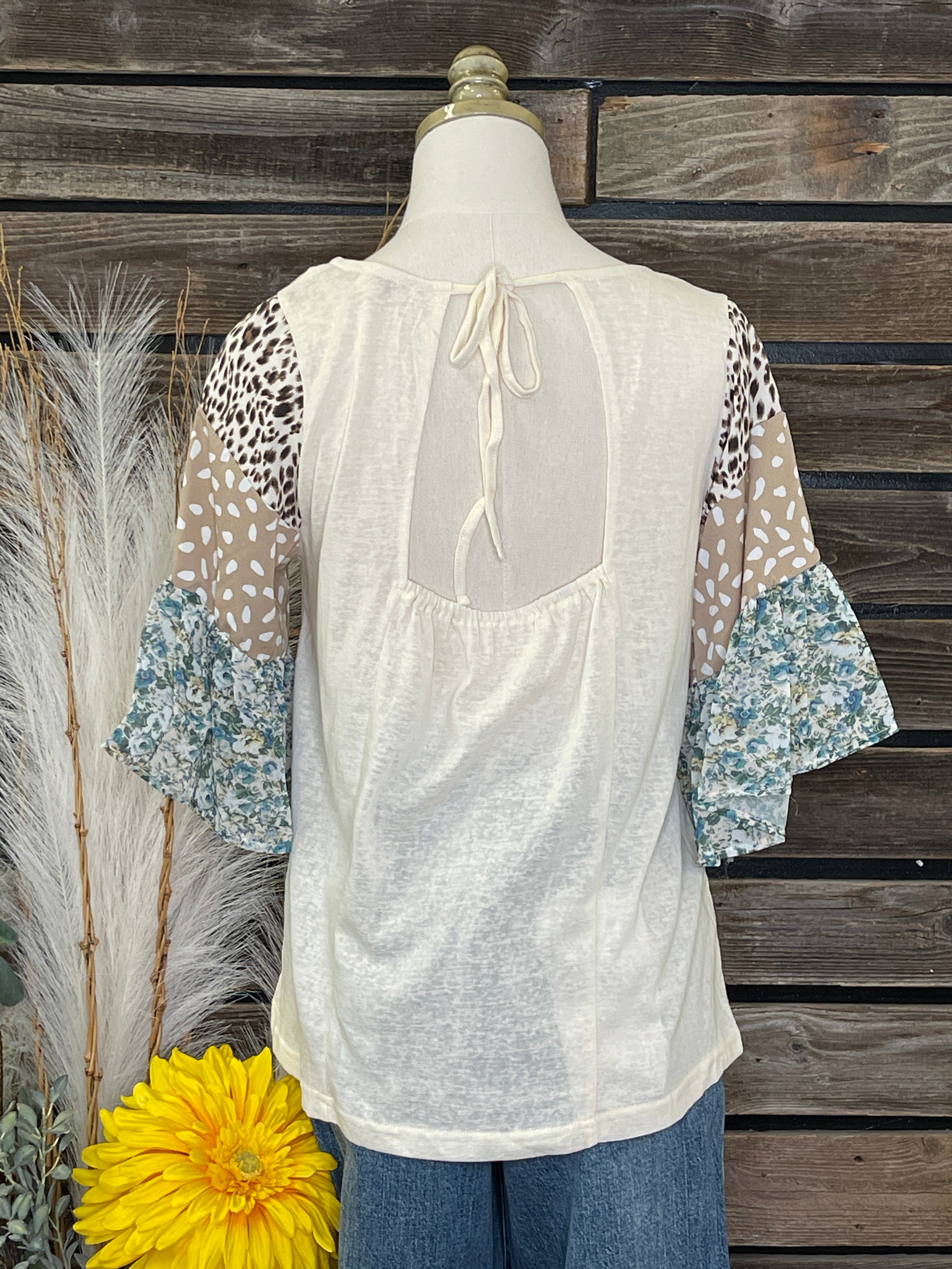 The soft cream body keeps things simple and easy, but those sleeves are where the magic happens—layered prints of leopard, soft taupe dots, and a delicate floral ruffle that adds a little romance to your everyday look. The keyhole opening in the back is flirty without being too much. It’s flowy, feminine, and so comfortable you’ll want to wear it from coffee dates to casual evenings out. Pair it with your favorite jeans and let those sleeves do all the talking.