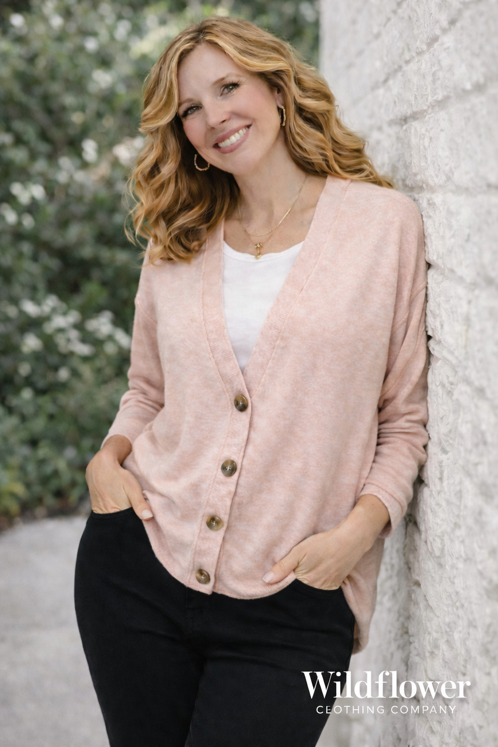 Soft as a quiet moment and easy as your everyday routine, the Blush & Still Cardigan is one of those layering pieces you’ll reach for without thinking twice. The gentle blush tone brings a warm, flattering glow, while the relaxed drape and drop shoulders give it that lived-in, comfortable feel we love for daily wear.